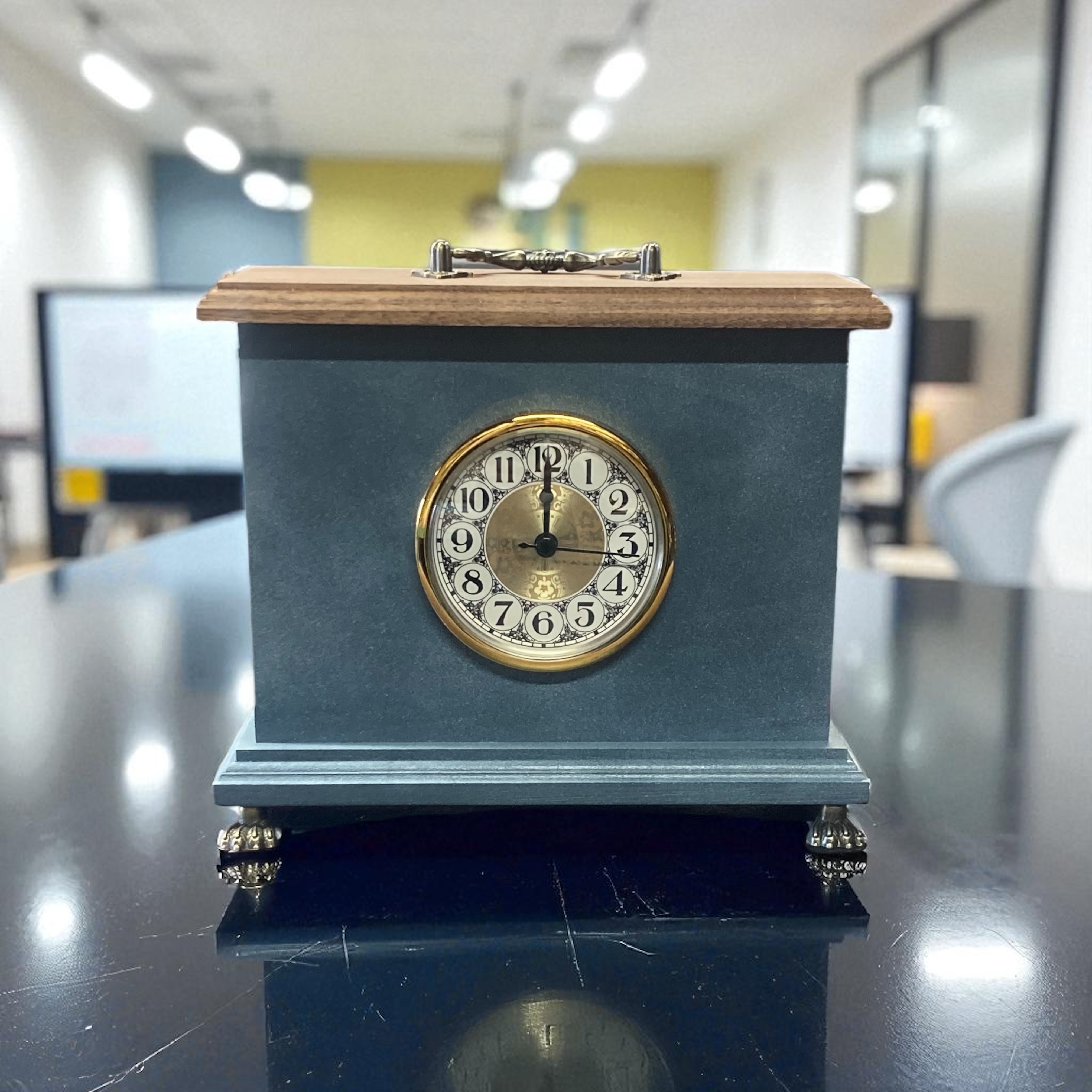 This clock is made of Walnut and Beech hardwood. The clock has been painted a sea gray . The top of the clock is Walnut it was coated in danish oil and let dry for several days.I then added antique feet to complete the look.