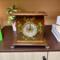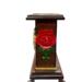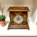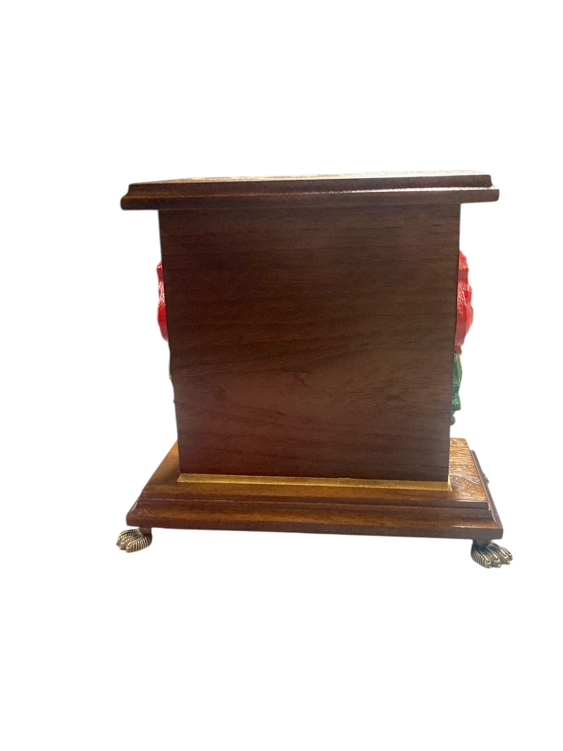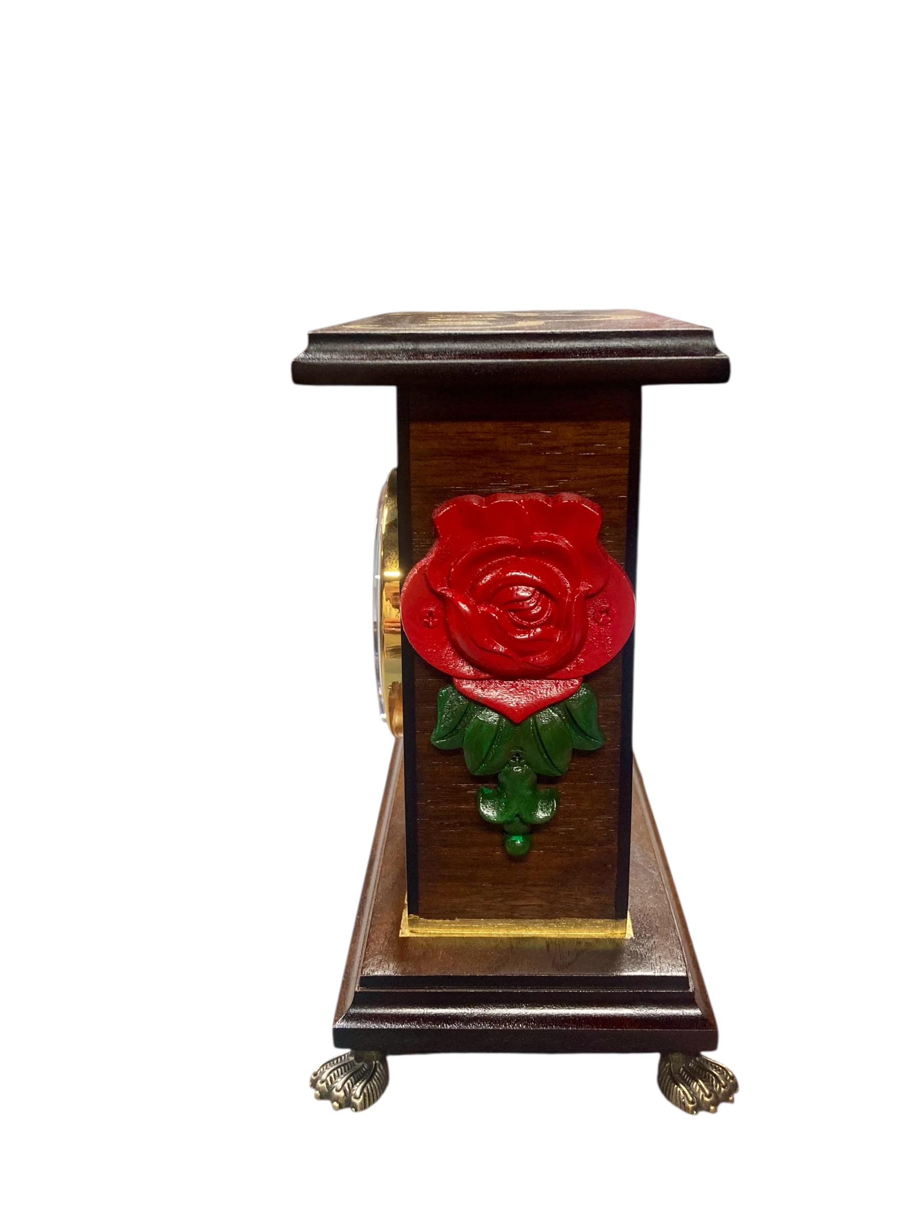 This clock is 7" x 6" she is made from Walnut hardwood. She is beautifully decorated with Rose on both sides. She has a quartz movement for accurate timing and wood feels very good to her touch.