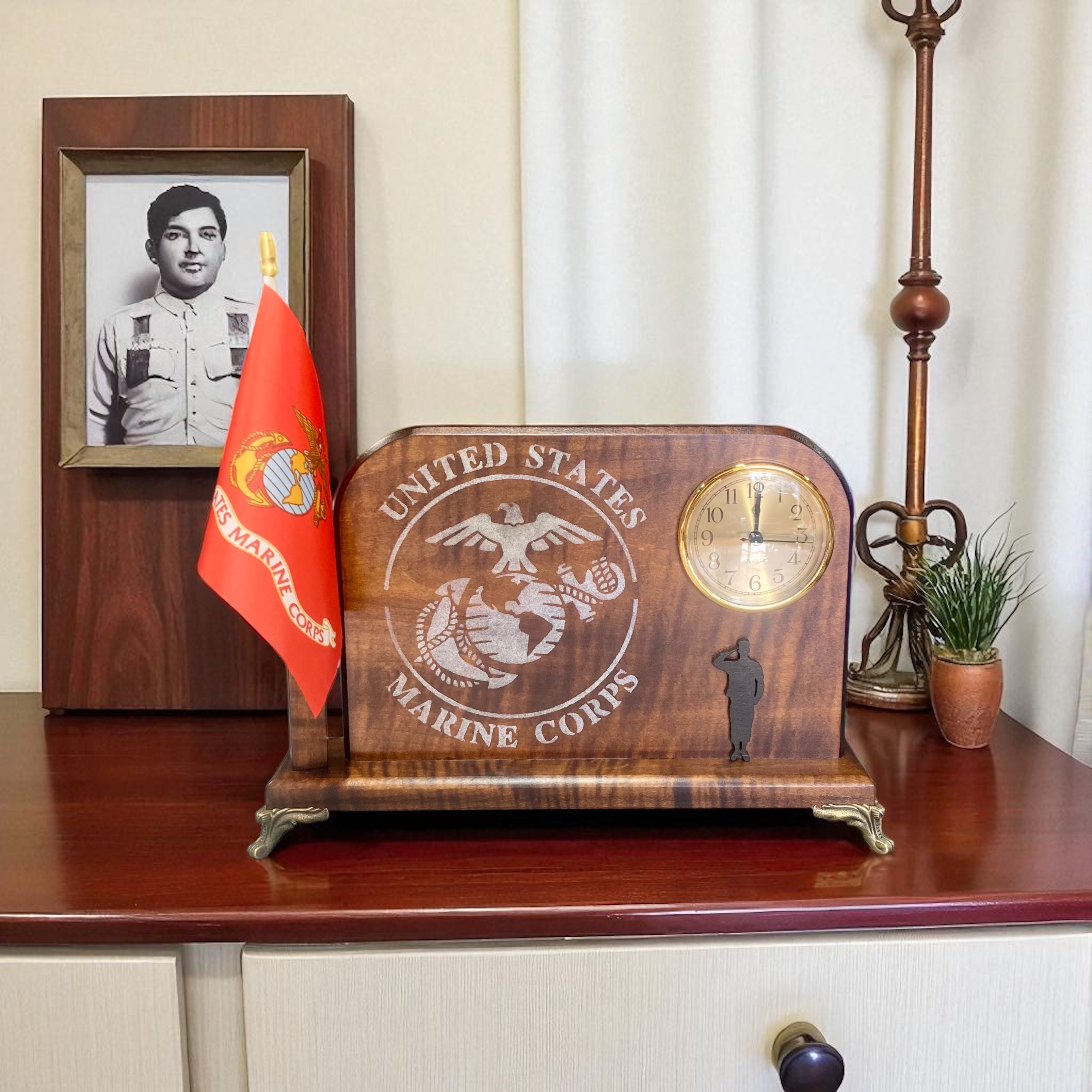 The beautiful clock was designed for those families that had a loved one serve in Marines .This clock would be a great way to remember their love ones that served in the military. This clock is 13" x 8" and the finish feels like a piece of furniture.